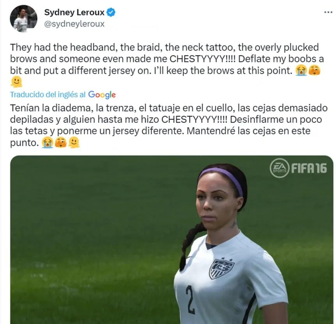 Una de las más contundentes fue Sydney Leroux, delantera de Angel City FC. “Me pusieron la vincha, la trenza, el tatuaje en el cuello, las cejas demasiado depiladas y alguien incluso me hizo pechugona. Desinflenme las tetas y pónganme otra talla de camiseta«, lanzó. Pero lejos estuvo de ser la única que apuntó contra EA Sports de forma contundente.