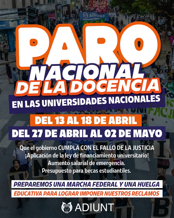 En Tucumán, ADIUNT se suma a los paros nacionales organizados por CONADU Histórica previstos para las semanas del 13 al 18 de abril y del 27 de abril al 2 de mayo. La movilización y la huelga aparecen, en este análisis, como vías necesarias para frenar el ajuste, recuperar salario y presupuesto, y defender la educación pública en su carácter universal y emancipador.