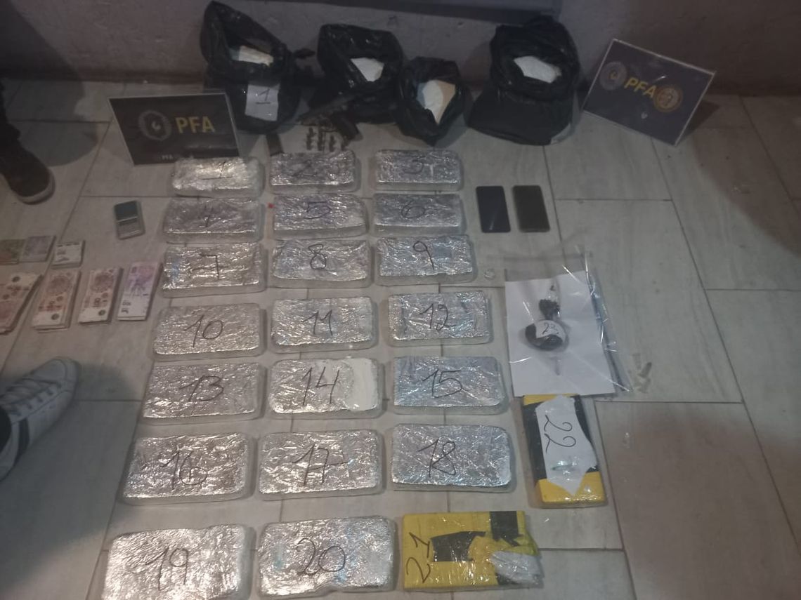Más de 40 kilos de cocaína, 20 de sustancia de corte, armas, vehículos y un millón y medio de pesos fueron secuestrados entre anoche y esta madrugada por la Policía Federal Argentina (PFA) en Rosario y otras ciudades santafesinas y fueron detenidas personas vinculadas a una banda criminal liderada por un preso, informaron fuentes policiales y judiciales.