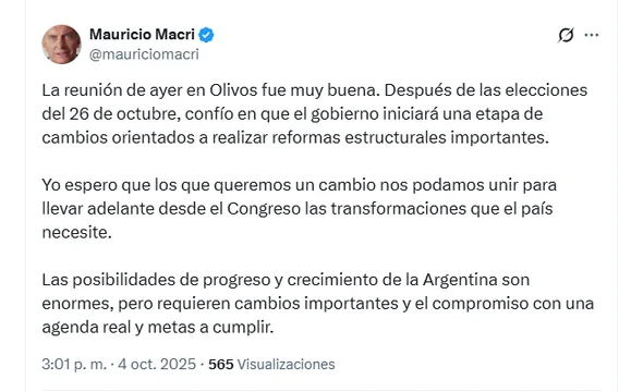 «La reunión de ayer en Olivos fue muy buena. Después de las elecciones del 26 de octubre, confío en que el gobierno iniciará una etapa de cambios orientados a realizar reformas estructurales importantes», afirmó Macri, confirmando la sintonía del encuentro.